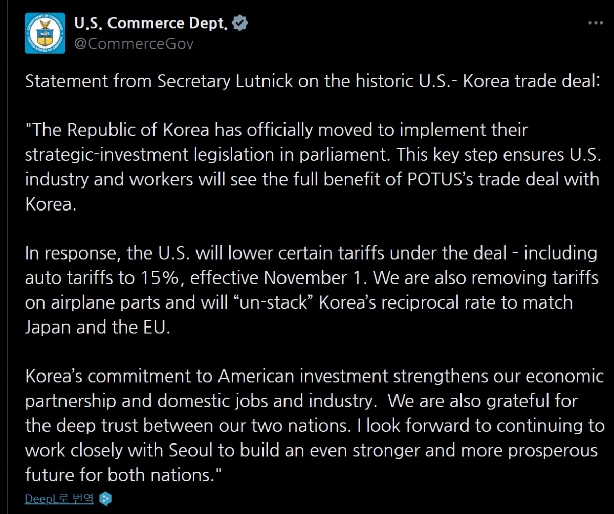 러트닉 장관은 1일(현지시간) 소셜미디어(SNS) X에 올린 성명에서 "한국이 국회에서 전략적 투자 법안을 시행하기 위한 공식 조처를 했다"며 "이 핵심 단계는 미국 산업과 노동자들이 한미 무역협정의 완전한 혜택을 볼 수 있도록 보장한다"고 밝혔다.