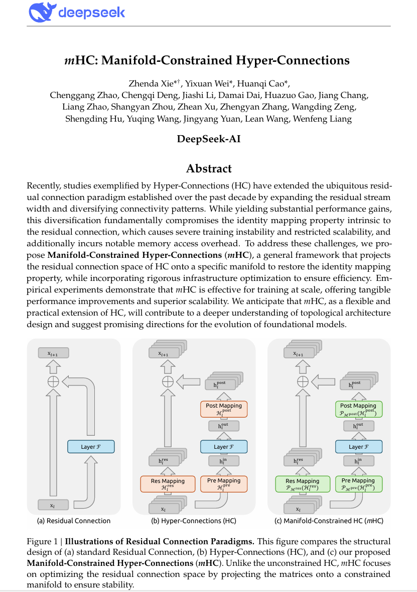 2일 디이차이징과 중국망 등 중국 현지 언론에 따르면 딥시크는 전일 'arXiv'에 'mHC: Manifold-Constrained Hyper-Connections(mHC: 유형 제약 초연결)'이란 제목의 연구 결과를 사전 논문 공개 형식으로 게재했다. 'arXiv'는 전 세계 AI 연구자들이 가장 먼저 연구 성과를 공개하는 국제 표준 플랫폼이다. 딥시크 창업자이자 최고경영자(CEO)인 량원펑이 공동 저자로 이름을 올렸고 딥시크에서 LLM 설계를 총괄하는 셰전다가 연구를 주도했다.