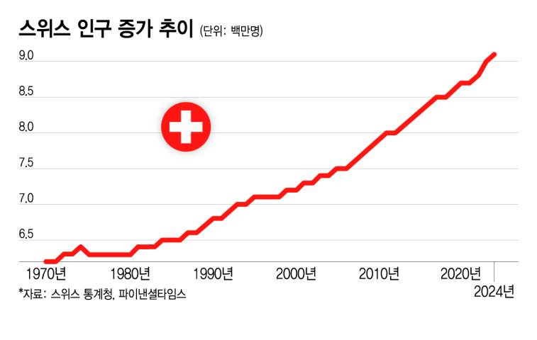 현재 스위스 인구는 약 910만명이다. 일각선 인구 1000만명 도달까지 10년도 걸리지 않을 거란 예측도 나온다. 높은 임금과 삶의 질에 매료된 이민자들이 꾸준히 유입되면서 외국인 거주자 비율은 27%로 유럽에서 가장 높은 수준이다. 2000년 이후에만 인구가 약 25% 급증했다. 비교하자면 같은 기간 미국은 약 20%, 프랑스는 12%, 한국은 9% 증가했다.
