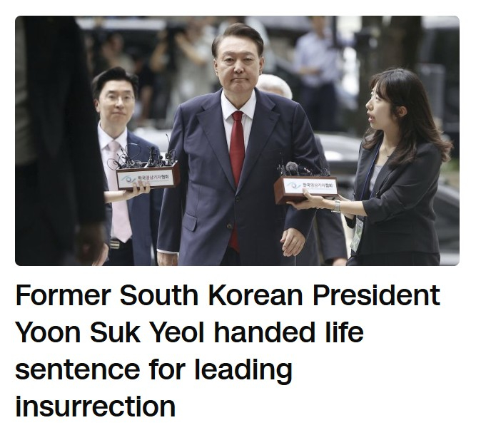 CNN은 이날 오후 "윤석열 전 대통령, 반란 주도죄로 종신형을 선고받았다"는 제목의 헤드라인으로 선고 소식을 전했다.
