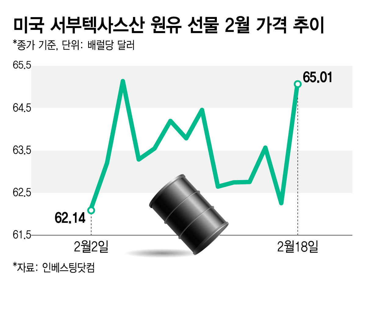 18일 뉴욕상업거래소에서 3월 인도분 서부텍사스산유(WTI)는 4.59% 급등한 65.19달러에 거래됐다. 안전자산으로 꼽히는 금 현물 가격은 2.22% 올라 온스당 4985.46달러를 기록했다.