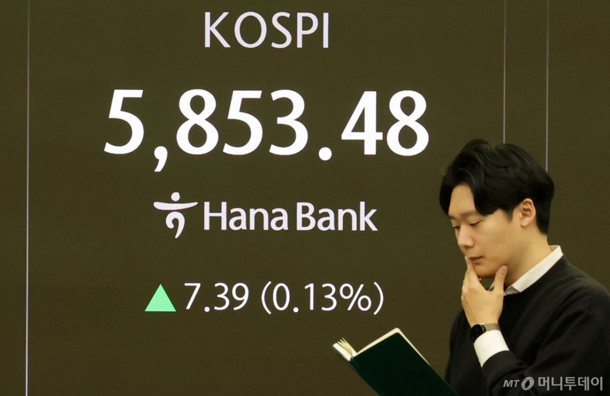 ![[서울=뉴시스] 홍효식 기자 = 코스피가 전 거래일(5846.09)보다 7.39포인트(0.13%) 오른 5853.48에 개장한 24일 오전 서울 중구 하나은행 딜링룸 전광판에 지수가 표시되고 있다. 코스닥 지수는 전 거래일(1151.99)보다 7.77포인트(0.67%) 오른 1159.76에 거래를 시작했다. 서울 외환시장에서 원·달러 환율은 전 거래일 주간거래 종가(1440.0원)보다 4.7원 오른 1444.7원에 출발했다. 2026.02.24. yesphoto@newsis.com /사진=홍효식](https://thumb.mt.co.kr/cdn-cgi/image/f=avif/21/2026/02/2026022412380443746_1.jpg)