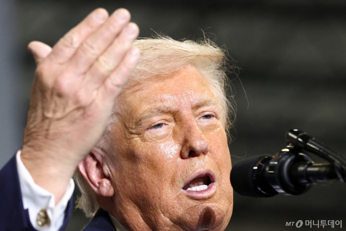 도널드 트럼프 미국 대통령이 지난 11일(현지시간) 켄터키주 헤브론에 위치한 버스트 로지스틱스를 방문해 연설하고 있다. /헤브론(미국) 로이터=뉴스1