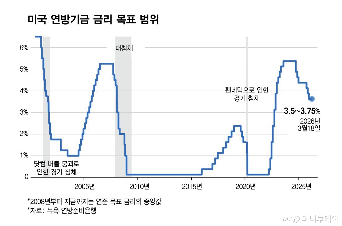 미국 연방준비제도(연준)가 18일(현지시간) 연방공개시장위원(FOMC)에서 예상대로 금리를 3.5~3.75%로 동결했다. 올해 금리 경로에 대해서도 한번 인하 전망을 유지했다. 최근 이란 분쟁으로 인한 유가 급등에도 일각에서 우려했던 중대한 매파적 전환은 없었다.