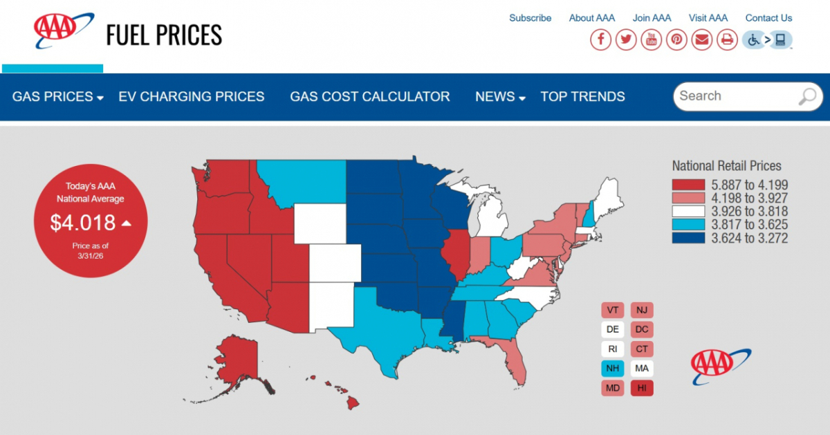 미국 자동차협회(AAA)에 따르면 이날 집계 기준으로 휘발유 평균 소매가격이 갤런당 4.018달러를 기록했다.