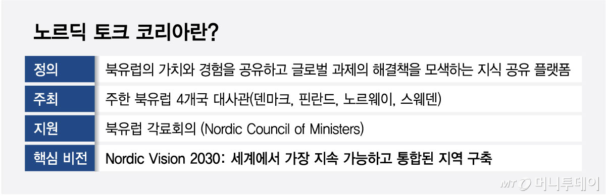 노르딕 토크 코리아는 북유럽 각료회의의 '2030 비전'에 발맞춰 기획됐다. 2030 비전은 '세계에서 가장 지속가능하고 하나 된 북유럽'으로, 지속가능성에 초점을 둔다. 이를 위해 노르딕 토크 코리아는 UN(국제연합, 유엔)의 17가지 지속가능발전목표(17 UN Sustainable Development Goals)를 중심으로 전 세계 시민들이 행동하고 변화에 참여하는 것을 목표로 하고 있다. 올해 노르딕 토크는 북유럽 4개국 대사관이 머니투데이와 손잡고 한국과 북유럽 국가들이 각종 난제에 대해 협력을 촉진하는 것을 목표로 진행한다.