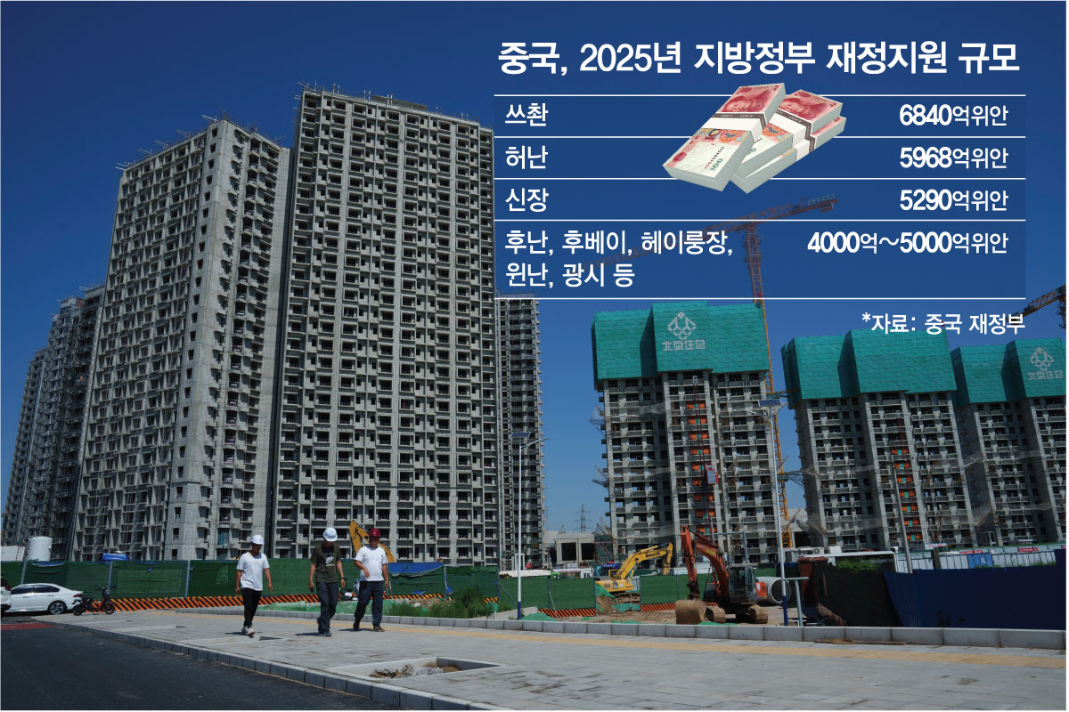 2016~2019년 5~6조위안대였던 지방 이전지출 규모는 코로나 팬데믹과 부동산 경기 둔화가 본격화된 2020년 8조위안대로 급격히 치솟았다. 이후 매년 늘어 2024년 10조위안을 넘어섰고 지난해 10조2000억위안까지 불어났다. 국유 토지 매각은 지방 정부 재정 수입의 40% 이상을 차지할 만큼 중요한 재원 확보 수단인데 부동산 장기 침체가 시작되면서 중앙으로부터의 재정 수혈이 늘어난 셈이다. 시장조사업체 중국지수연구원에 따르면 지난해 중국 300대 도시의 주택용지 매각 수입은 10.7% 감소한 2조3000억위안(약 508조원)으로 2020년 대비 65.2% 급감했다.