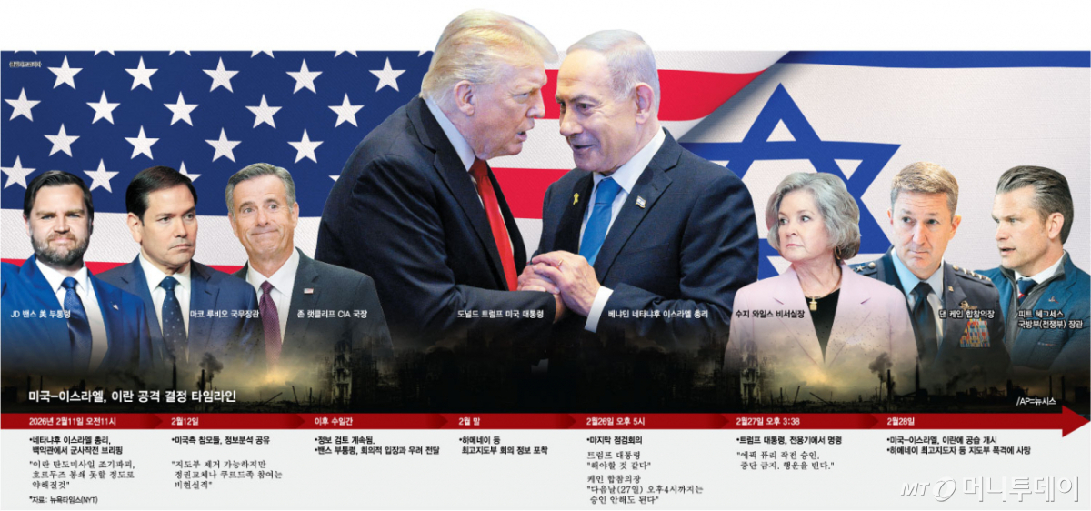 NYT가 익명의 취재원을 통해 재구성한 내용에 따르면 지난 2월11일 오전 11시쯤 검은색 SUV(다목적스포츠차량)가 백악관에 도착했다. 여기서 내린 네타냐후 총리는 기자들에게 포착되지 않고 백악관으로 들어갔다. 그는 내각 회의실, 곧이어 한 층 아래의 백악관 상황실에서 트럼프 대통령과 참모진을 대상으로 이란에 대한 극비 브리핑을 진행했다. 네타냐후 총리가 등지고 앉은 대형 스크린엔 세계 최고 정보기관으로 불리는 이스라엘 모사드의 데이비드 바르네아 국장이 화상으로 등장했다.