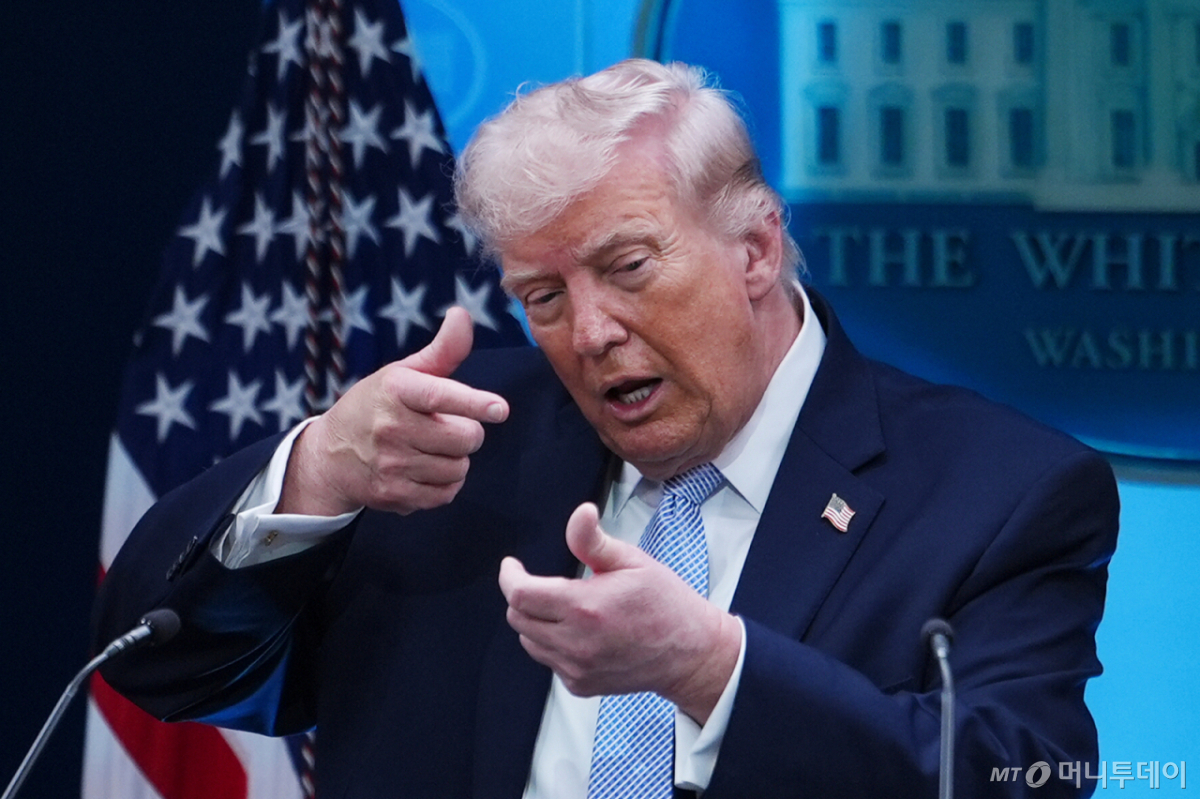 ![[워싱턴=AP/뉴시스] 도널드 트럼프 미국 대통령이 6일(현지 시간) 백악관 브리핑룸에서 기자회견 중 저격용 총을 겨누는 시늉을 하고 있다. 2026.04.07. /사진=민경찬](https://thumb.mt.co.kr/cdn-cgi/image/f=avif/21/2026/04/2026041222121060172_1.jpg)