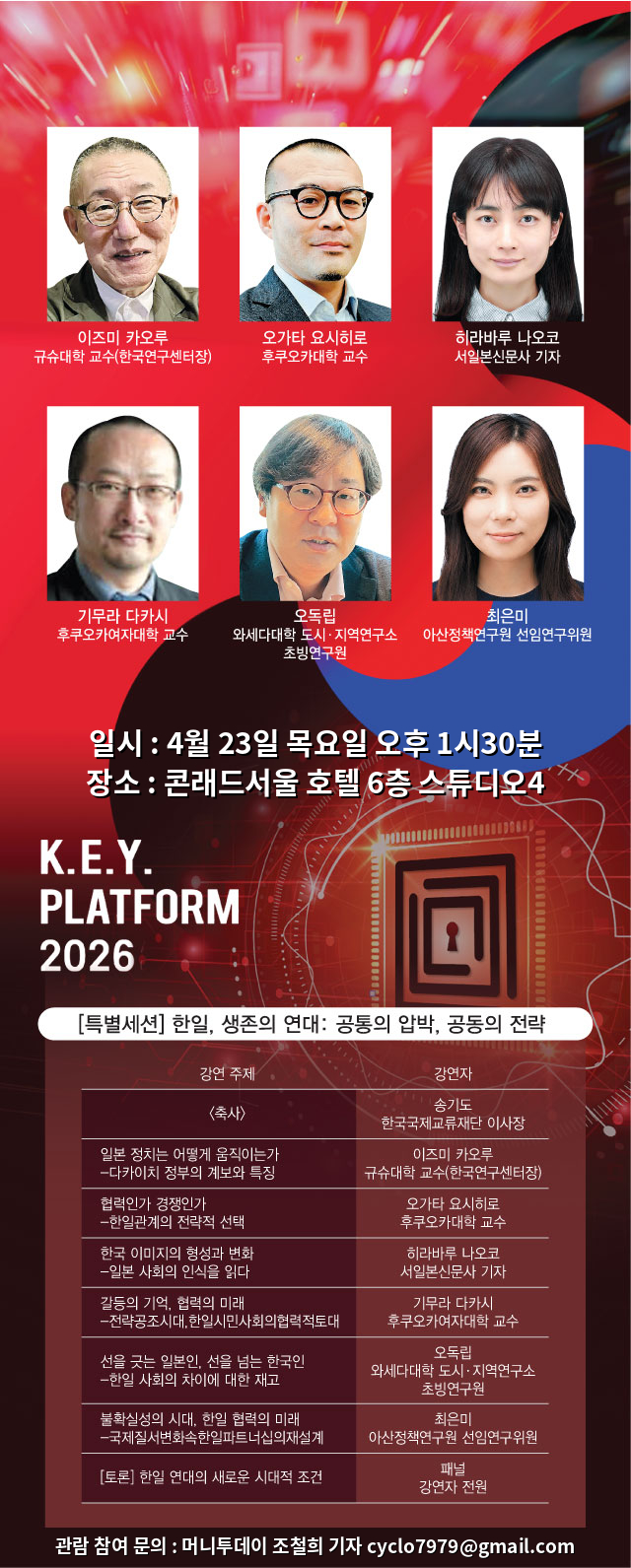 '2026 키플랫폼' 일본 특별세션은 이러한 실용성을 지향한다. 일본 내부의 논의를 직접 듣는 드문 기회라는 점이 첫번째 실용성이다. 일본에 대한 외부적인 해설이나 요약이 아니라 일본 학자들과 현장 기자의 언어로 실제 현실을 직접 들을 수 있는 기회다. 한일관계를 감상이 아니라 구조와 전략으로 이해하는 자리로서 누가 더 옳은가를 따지는 것이 아니라 한일 양국에서 실제로 무엇이 어떻게 작동하는가를 알아볼 계획이다. 한국이 일본을 다시 공부해야 하는 이유와 한일관계를 다시 설계해야 하는 이유를 짚어보고, 공통의 압박 속에서 공동의 전략이 왜 가능한지 살펴볼 예정이다.