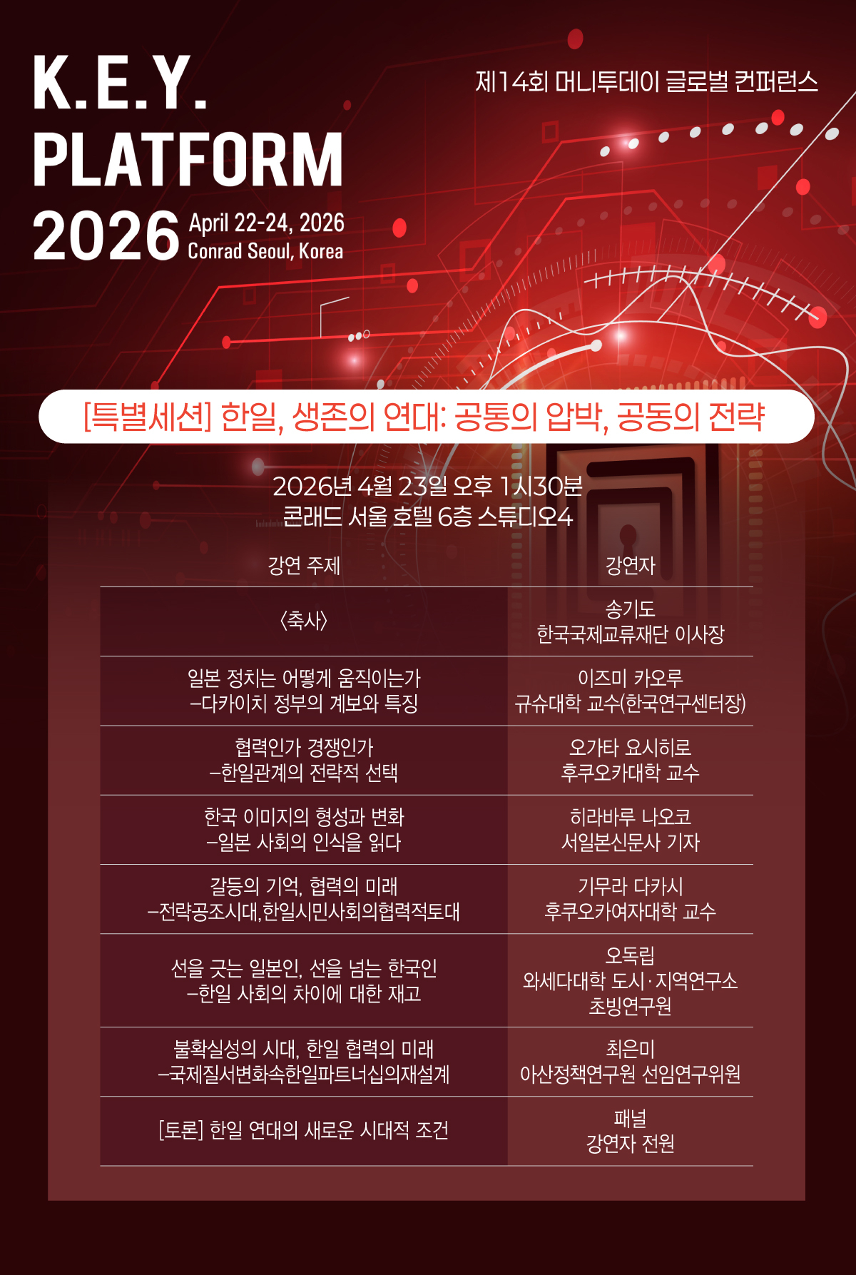 국제질서의 급변, 미국의 자국우선주의, 공급망 재편, 중동 리스크, 기술 패권 경쟁이 한꺼번에 파도처럼 밀려오는 시대에 한일은 공통의 압박을 받는 두 중견국이 됐다. 이런 상황에서 한일관계는 기존처럼 과거사에 대한 기억만으로는 설명되지 않는다. 머니투데이가 오는 23일 서울 여의도 콘래드서울 호텔에서 개최하는 제14회 글로벌 콘퍼런스 '2026 키플랫폼'(K.E.Y. PLATFORM 2026)에서 일본 특별세션 '한일, 생존의 연대: 공통의 압박, 공동의 전략'을 내건 이유도 여기에 있다. 이 세션은 한일관계를 더 이상 감정의 프레임이 아니라 전략의 프레임으로 읽어야 한다는 문제의식 위에 있다.