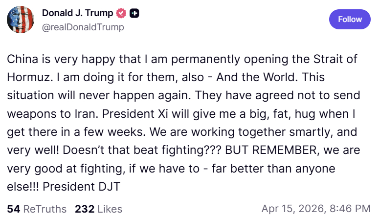 도널드 트럼프 미국 대통령이 "중국은 내가 호르무즈 해협을 영구적으로 개방하려는 것에 매우 기뻐하고 있다"며 중국이 이란에 무기를 제공하지 않기로 했다고 밝혔다.