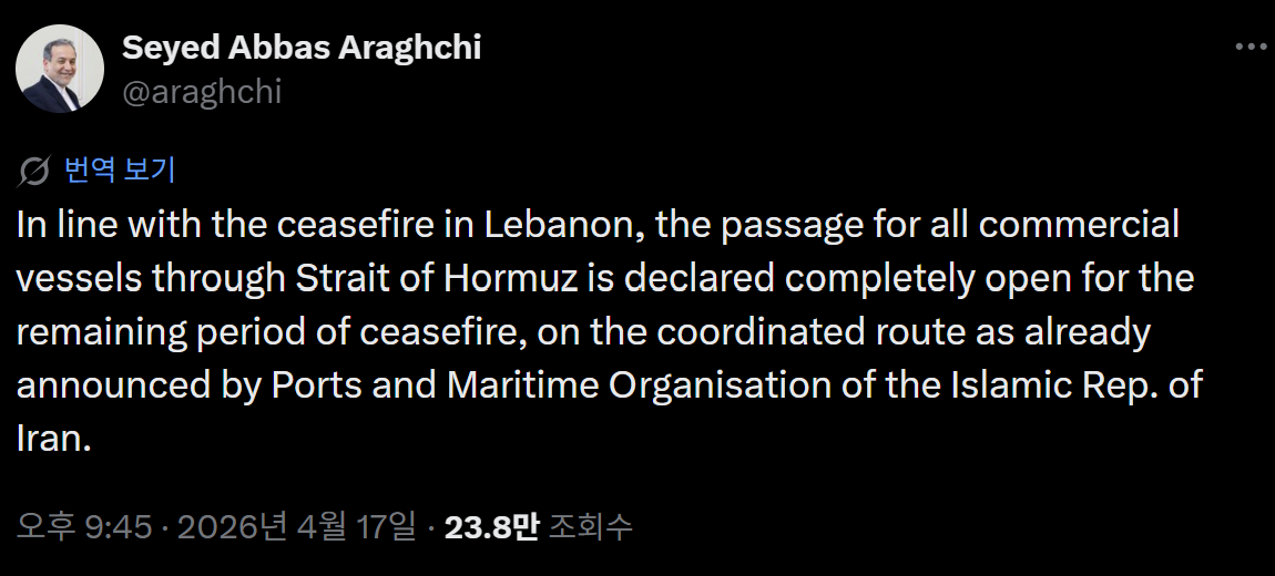아바스 아라그치 이란 외무부 장관은 17일 X를 통해 "레바논 휴전에 따라, 호르무즈 해협을 통과하는 모든 상업용 선박의 통항을 남은 휴전 기간 동안 완전히 개방할 것"이라고 밝혔다. 또 통항의 경우 "이란 이슬람공화국 항만해사청이 이미 발표한 대로 조율된 루트를 통해 이뤄질 것"이라고 설명했다.