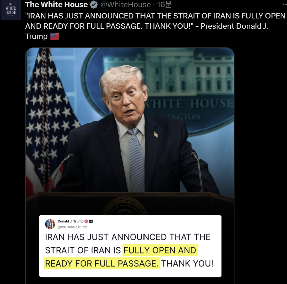 아라그치 장관의 발표 직후 도널드 트럼프 미국 대통령은 트루스소셜에 "방금 이란 측에서 해협이 완전히 개방됐고 전면적인 통항이 준비됐다고 발표했다. 감사하다"고 적었다. 다만 "이란과의 거래가 100% 완료될 때까지는 이란에 대한 해군의 봉쇄 조치는 전적으로 유지될 것"이라며 "대부분의 사항이 이미 협상된 상태이므로 이 과정은 매우 신속하게 진행될 것"이라고 덧붙였다.