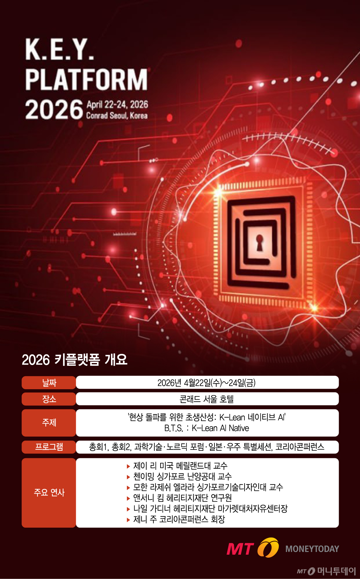 오는 22~24일 서울 여의도 콘래드 서울 호텔에서 '현상 돌파를 위한 초생산성: K-Lean 네이티브 AI'(B.T.S. : K-Lean AI Native)를 주제로 열리는 머니투데이 글로벌 콘퍼런스 '2026 키플랫폼'(K.E.Y. PLATFORM 2026)은 피지컬 AI와 국제정세 분야의 세계 최고 전문가들을 모셨습니다.