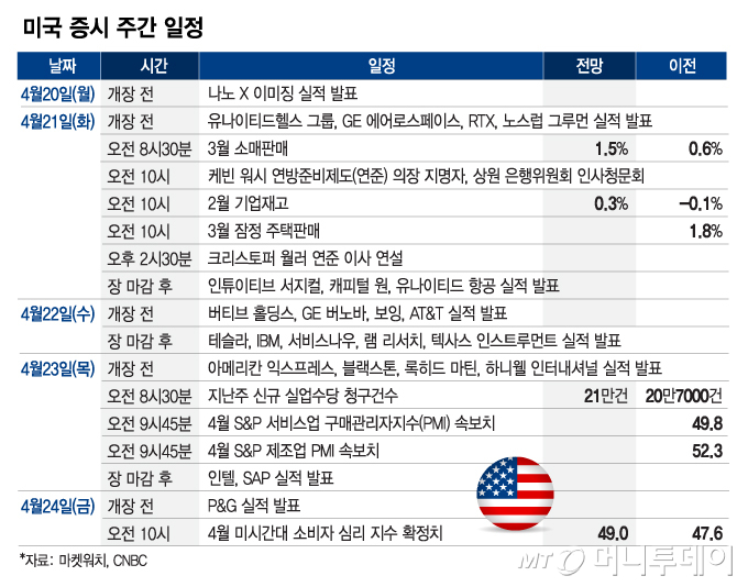 경제지표 중에서는 오는 21일 나오는 지난 3월 소매판매가 중요하다. 이란 전쟁으로 소비자 심리가 약화되고 있던 상황에서 미국 경제의 3분의 2를 차지하는 소비 동향을 파악할 수 있기 때문이다. 다우존스에 따르면 이란 전쟁에도 3월 소매판매는 전월비 1.5% 증가했을 것으로 전망된다. 오는 24일에는 4월 미시간대 소비자 심리지수 확정치가 발표된다.