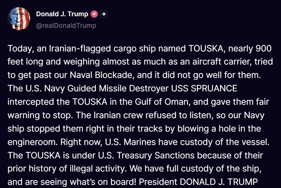 [미국-이란 전쟁] /사진=도널드 트럼프 미국 대통령 트루스소셜 도널드 트럼프 미국 대통령이 19일(현지시간) SNS(소셜미디어) 트루스소셜을 통해 미군이 미국의 대(對)이란 해상 봉쇄를 돌파하려던 이란 화물선을 나포했다고 밝혔다. 독자들의 PICK! 부부관계 2년 거부, 성기능 개선제 몰래 먹는 남편…유책 사유 될까 '성매매 논란' 지나, 결혼·출산?…웨딩드레스 이어 유모차까지 100만원도 못 벌던 개그맨..."수입 1000배" 변호사 된 깜짝 근황 엄마 출근하면 돌변한 아빠...'미성년' 의붓딸 성폭행, 2살 친딸도 폭행