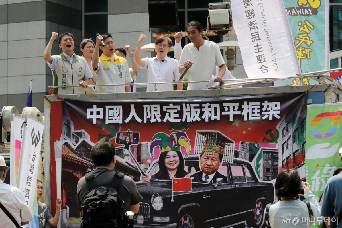 ![[타이베이=AP/뉴시스] 14일(현지 시간) 대만 타이베이 국민당(KMT) 당사 앞에서 시위대가 지난 10일 베이징에서 시진핑 중국 국가주석과 회동한 정리윈 주석을 규탄하는 구호를 외치고 있다. 이들이 설치한 펼침막에는 “중국판 한정 평화 프레임”이라고 적혀 있다. 2026.04.14. /사진=민경찬](https://thumb.mt.co.kr/cdn-cgi/image/f=avif/21/2026/04/2026042211101187633_1.jpg)