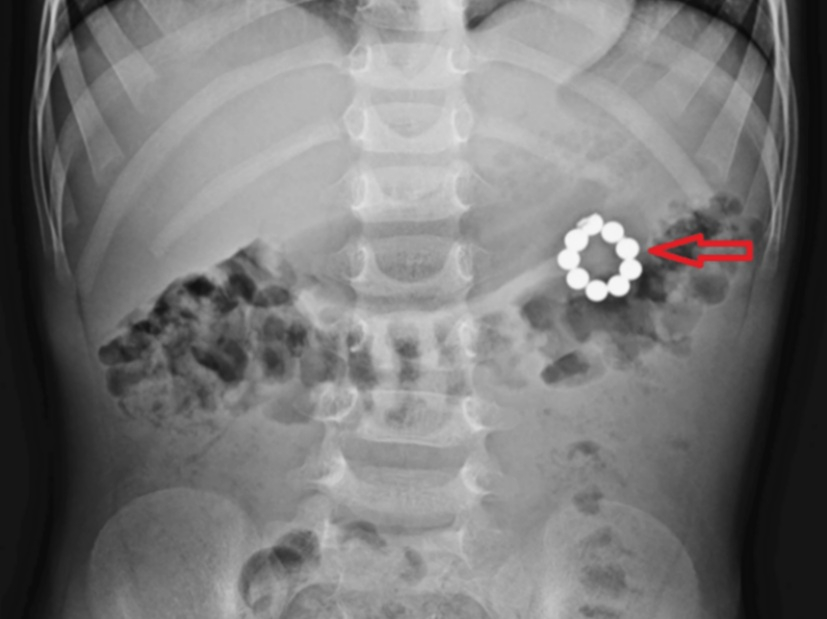 의료진에 따르면 아이는 3일간 복통과 메스꺼움 등을 겪다가 병원에 방문했다. 복부 엑스레이 촬영 결과, 아이의 뱃속에 여러 개의 구슬이 연결된 모양의 이물질이 관찰됐다.