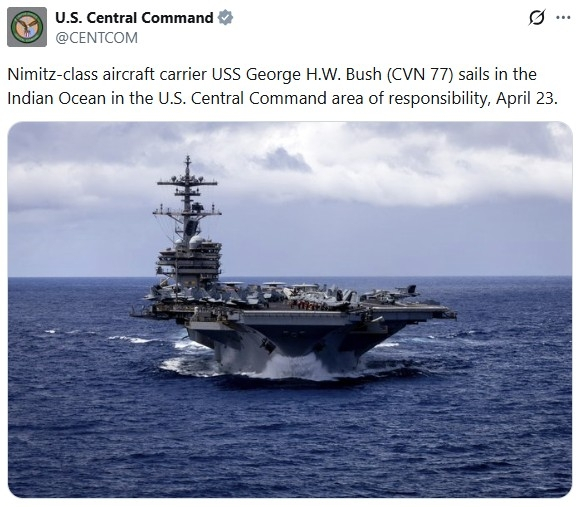 미 중부사령부는 이날 소셜미디어 X(옛 트위터) 계정을 통해 "니미츠급 항공모함 조지 H.W. 부시호가 4월 23일 중부사령부 책임구역인 인도양에서 항해하고 있다"며 갑판 위에 전투기 등이 배치된 부시호 사진을 올렸다.