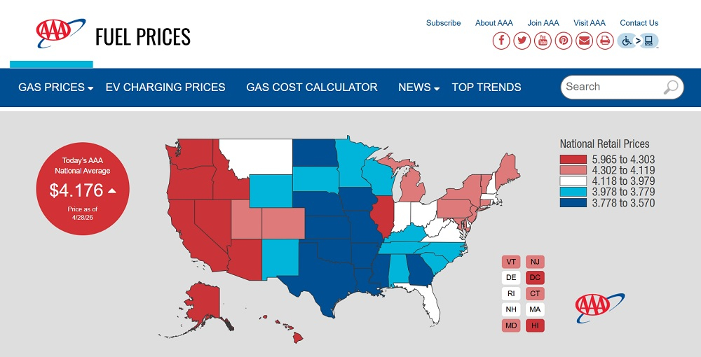 전미자동차협회에 따르면 미국 휘발유 평균 소매가격이 이날 갤런(약 3.78L)당 4.176달러로 2022년 8월 이후 3년 8개월 만에 가장 높은 수준을 기록했다.