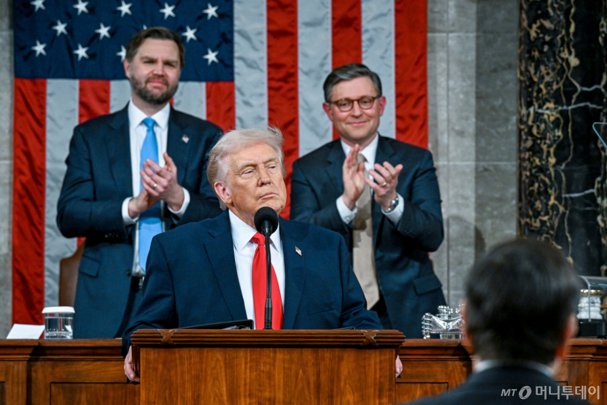![[워싱턴=AP/뉴시스] 도널드 트럼프 미국 대통령이 24일(현지 시간) 워싱턴 국회의사당 하원 본회의장 상·하원 합동회의에서 집권 2기 첫 국정연설(State of the Union)을 하면서 JD 밴스 부통령과 마이크 존슨 하원의장의 박수를 받고 있다. 2026.02.25. /사진=민경찬](https://thumb.mt.co.kr/cdn-cgi/image/f=avif/21/2026/04/2026042909423843718_2.jpg)